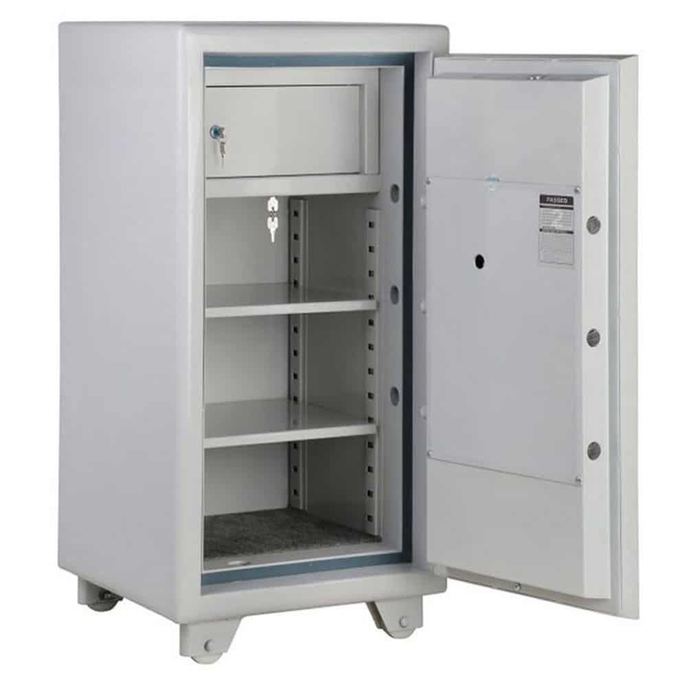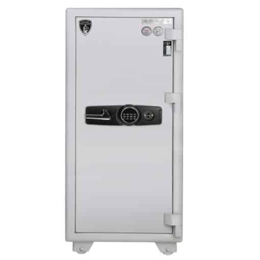 صندوق نسوز گنجینه محصول شرکت گنجینه مهر پارس با به روز ترین سیستم ضد سرقت و قفل های ضد دزد و سیستم کد بندی غیر قابل رد یابی می باشد. این صندوق مقاوم در برابر حریق تا 60 دقیقه حرارت مسقیم 800 درجه سانتیگراد ،دارنده استاندارد ملی ایران ، دارای زبانه ضد سرقت ، دارای چرخ برای سهولت جابه جایی و قابلیت باز کردن چرخ ها می باشد. مواد خاص تزریق شده داخل جداره میانی که باعث مقاوم شدن در برابر حریق و دیلم و مته و برش ، جنس ورق فولادی از نوع st37می باشد ورق بدنه و درب ضخامت 2میلیمتر ، رنگ از نوع الکترواستاتیک پودری ، درب بند اتومات ، مکانیزم از نوع صفحه ای مقاوم در برابر سرقت ، دارای زبانه های فولادی از چهار جهت درب ، لولا از نوع جدا شونده می باشد